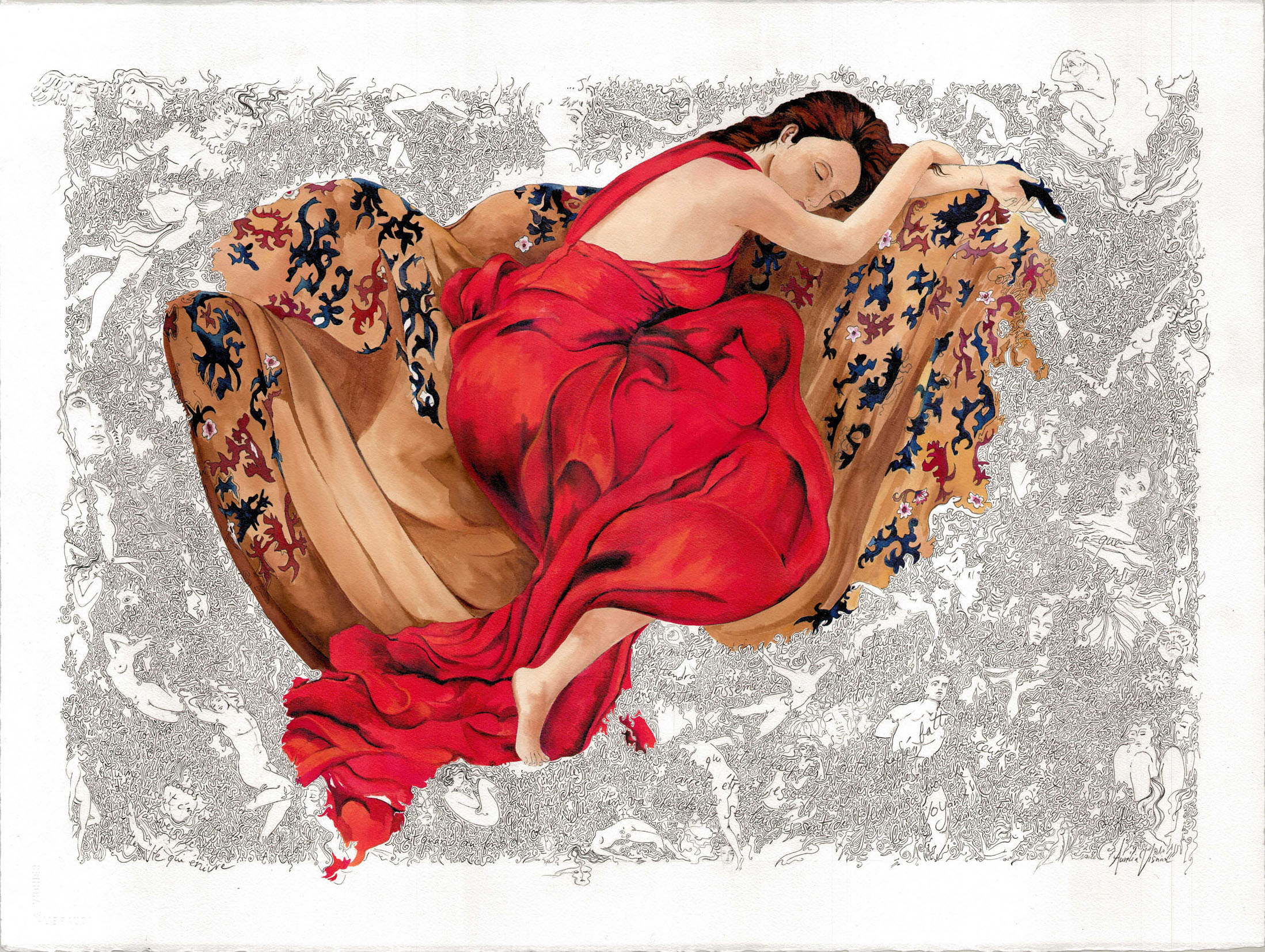 Par le détournement d’oeuvres d’art de l’Antiquité, de la Renaissance ou de l’époque contemporaine, j’emprunte une figure, une posture autour desquelles viennent se greffer des citations d’écrivains, paroliers et cinéastes qui m’ont toujours inspirée : ces dernières ont parfois une incidence sur l’élaboration du dessin ou des éléments figuratifs que j’instille çà et là parmi les entrelacs...